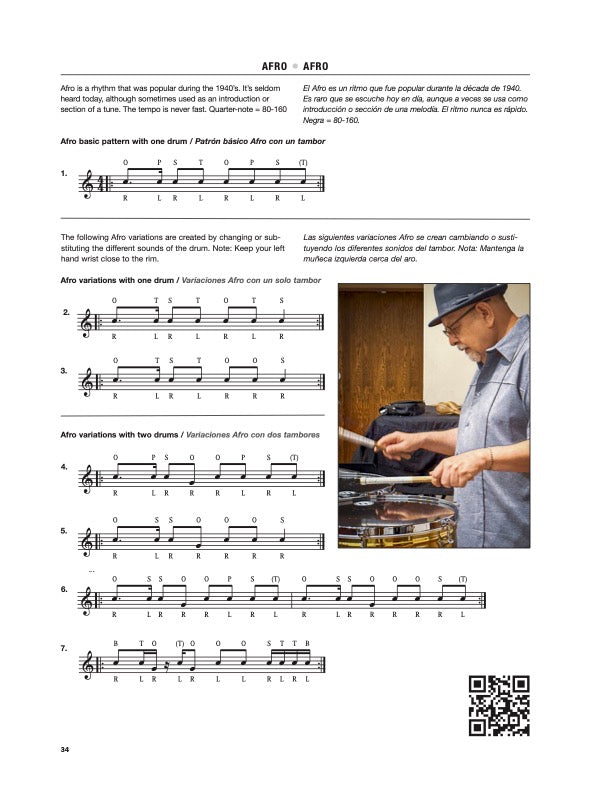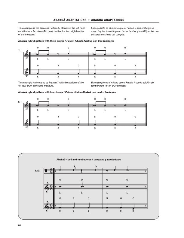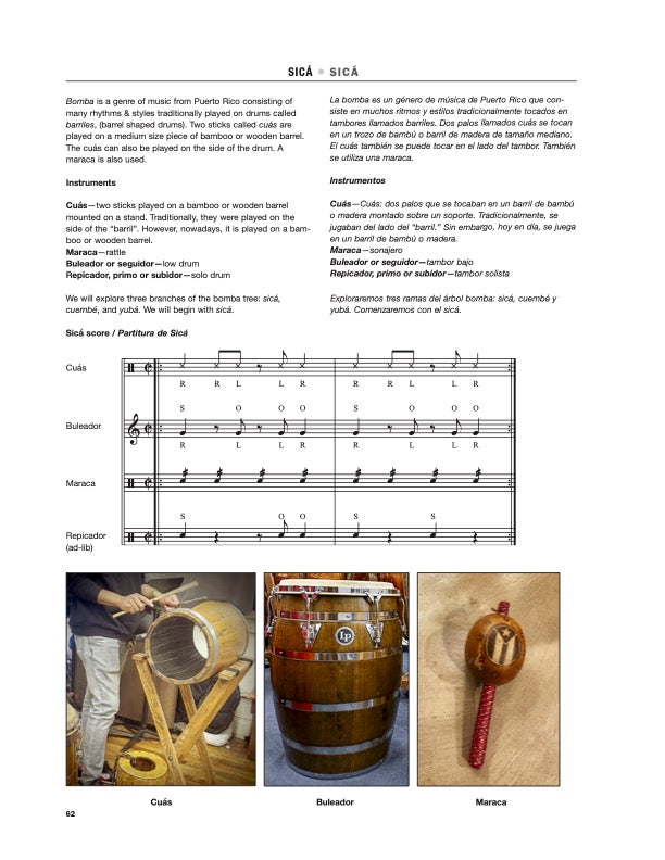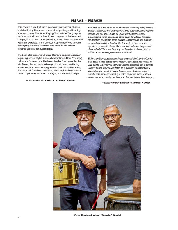 All text in this book is presented in both English and Spanish, there are numerous pictures accompanying the techniques explained and styles explored, and headings at the top of each page make it easy to locate specific content. For those looking to learn about and how to play congas, this is a quality resource worth exploring."—Josh Gottry, Percussive Notes, Volume 63, No. 3 – June 2025